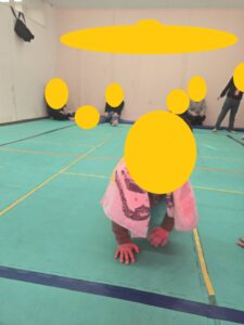まずは、準備運動でハイハイ、膝立歩き、ジャンプなどいろいろな動きをして体を動かしました。