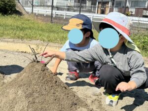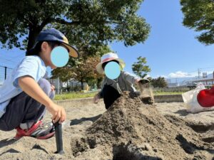 砂場では大きな山をお友達と協力して作っていました。
