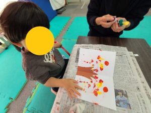 あか・きいろ・みどりの絵具を指につけて!二つ折りしてぱっと広げると