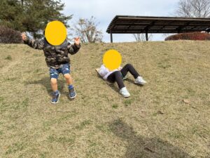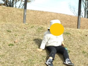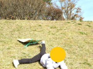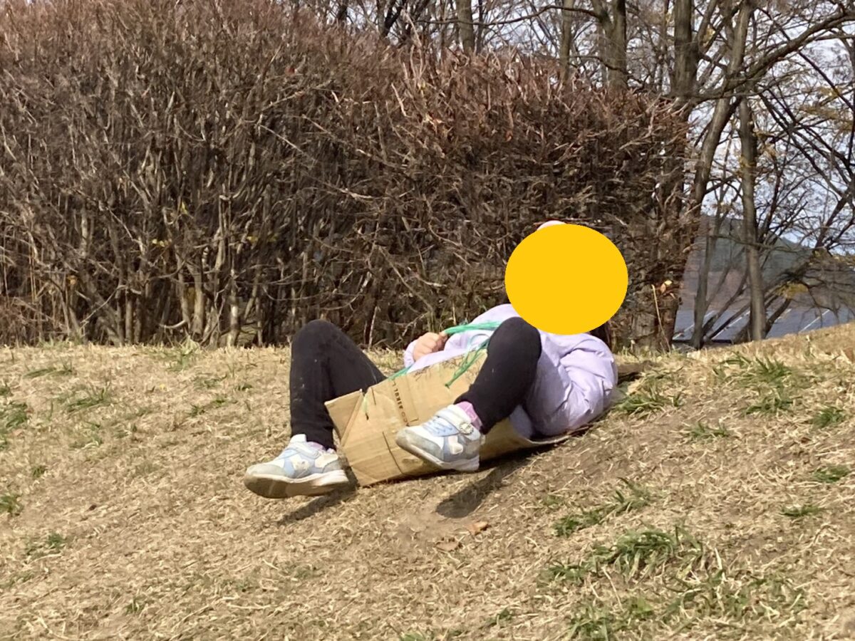 この公園には、少し急な土手があるので、スタッフが段ボールでソリを作ったので滑ってみました!