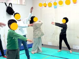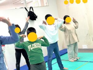 クイックフェイントができるようにラジオ体操をして身体全体をほぐしました。