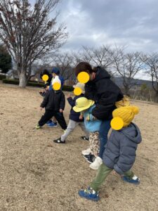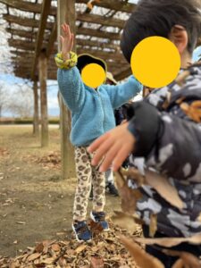 かけっこが終わり、最後に落ち葉を舞い上げて帰って来ました!