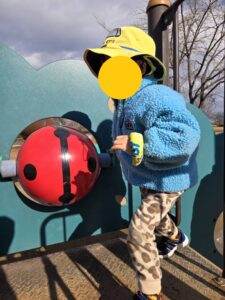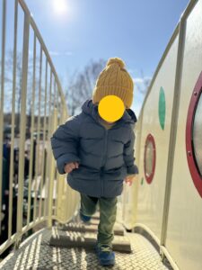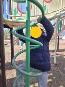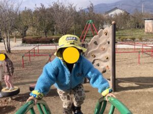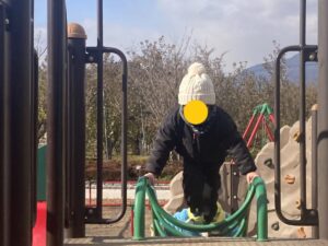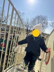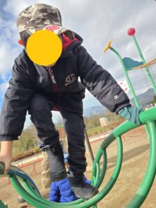 鉄製の冷たい遊具で手が冷たくなっても全然平気。ガンガン登って行きます。