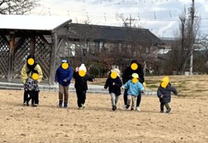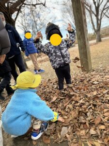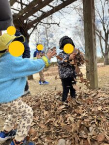かけっこが終わり、最後に落ち葉を舞い上げて帰って来ました!