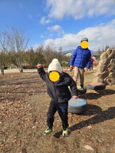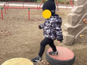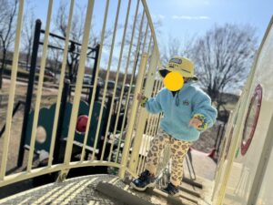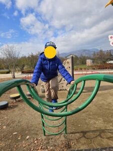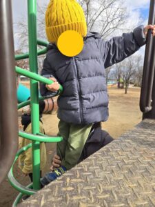 鉄製の冷たい遊具で手が冷たくなっても全然平気。ガンガン登って行きます。