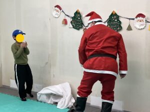 運動遊びのメニューにサンタさんが転んだよ!があったので、気になっていたら、おともだちみんなが「サンタさ~ん」と呼びました。すると「シャンシャンシャン」言いながらサンタさんが登場したよ。