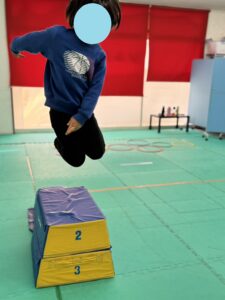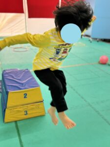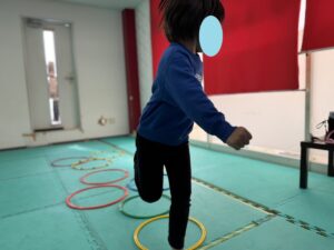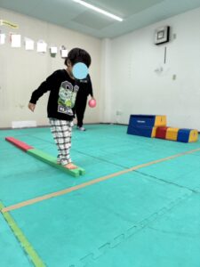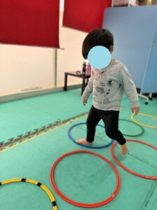 まずは平均台を歩き…フープをケンケンパ!で飛びます。