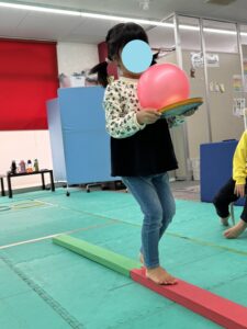 平均台はお皿にボールを乗せて落ちないように歩きます。