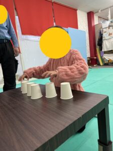 運動遊びが終わり、静かな活動で何をしようか迷っていたお友達に「紙コップタワーをしてみる?」と提案してみると、「あっ、ボールを入れたらいいかも!!」と更なる案を出してくれたので、ボール探しに変更して始めました。