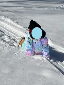 でも雪が柔らかいおかげで全然痛くない様子で、「転んじゃった~」とニコニコ笑顔(≧▽≦)