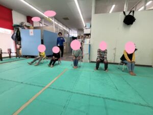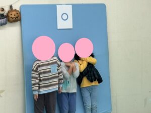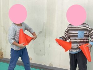 カラーコーンに輪投げして・・・・楽しく体を動かしました。