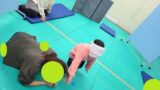 ローラーすべり台で一緒にすべろうと、年上のお友達がスピード調整をしながら滑ります。