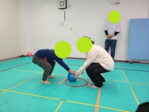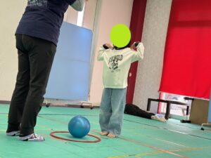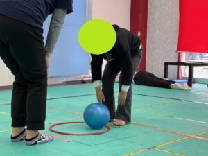 スタッフが「頭、ひざ、つま先・・・」など体の一部を伝えて、途中で「ボール」と伝えます。