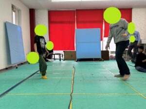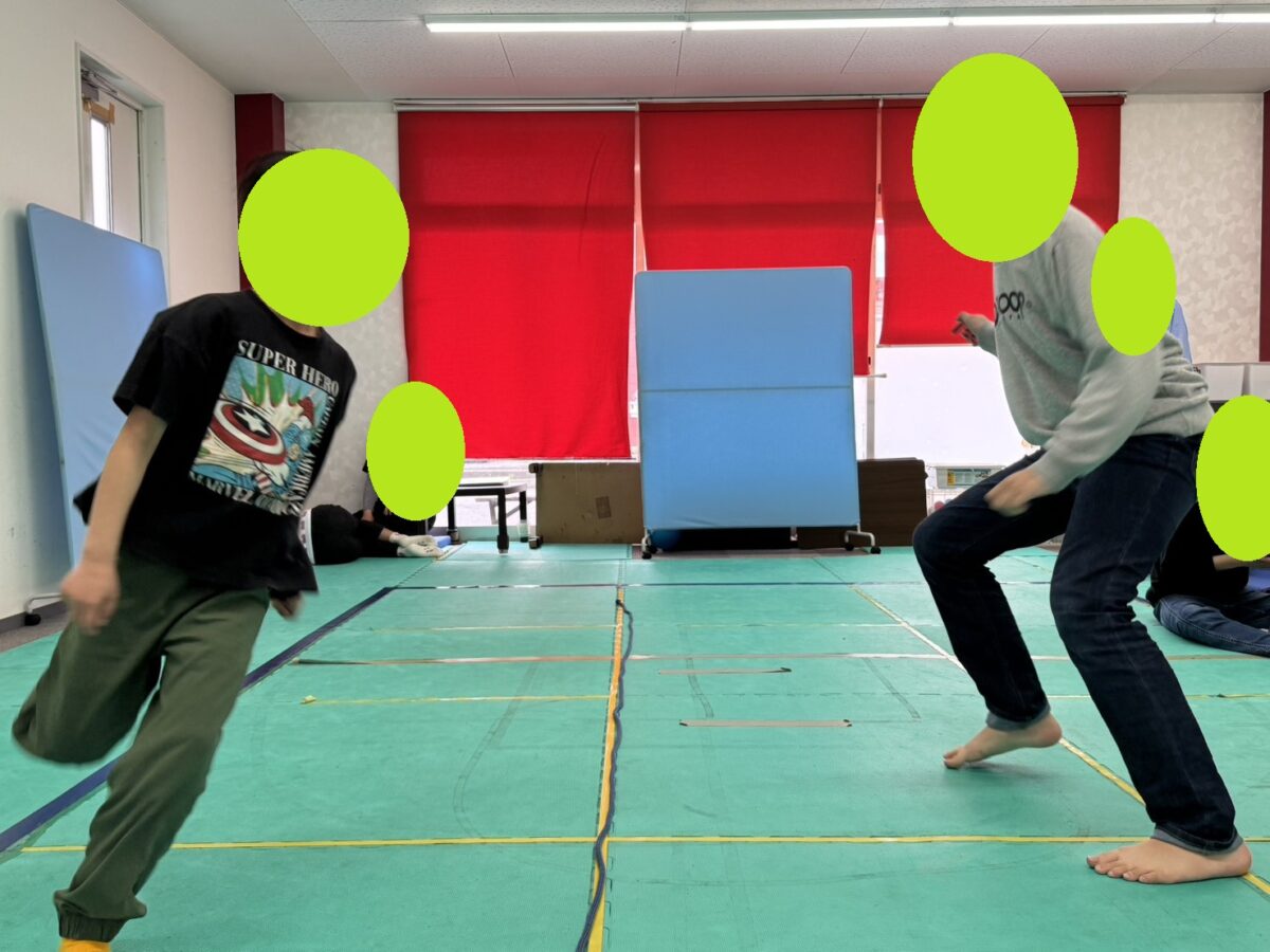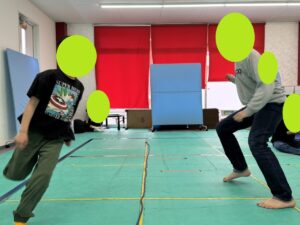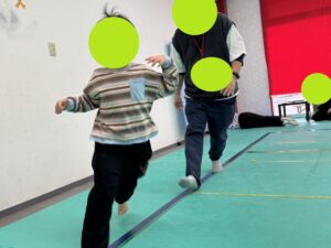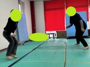 縄を飛び越えてはいけないので、相手の動きを見て左右どちらに動くのかの駆け引きをしながらタッチされないように鬼ごっこを楽しみました!!