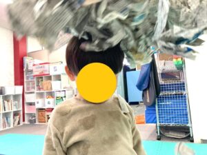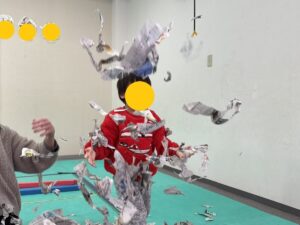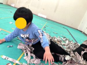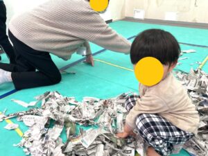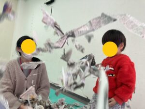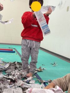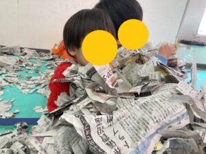 新聞紙をみんなでビリビリ小さな手でやぶいて細かくしました。