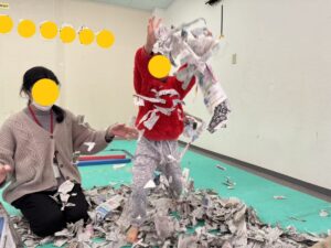 ちぎった新聞紙を拾ったり、上に放り投げたりするといい運動になり暖かくなりました。