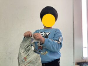 自分で新聞紙をかき集めて上にふわり!量が足りないからスタッフにお願いして!