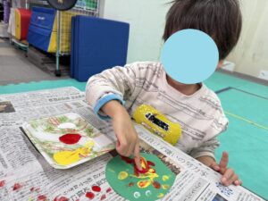 絵具でフィンガ―ペインティングを行うお友達。