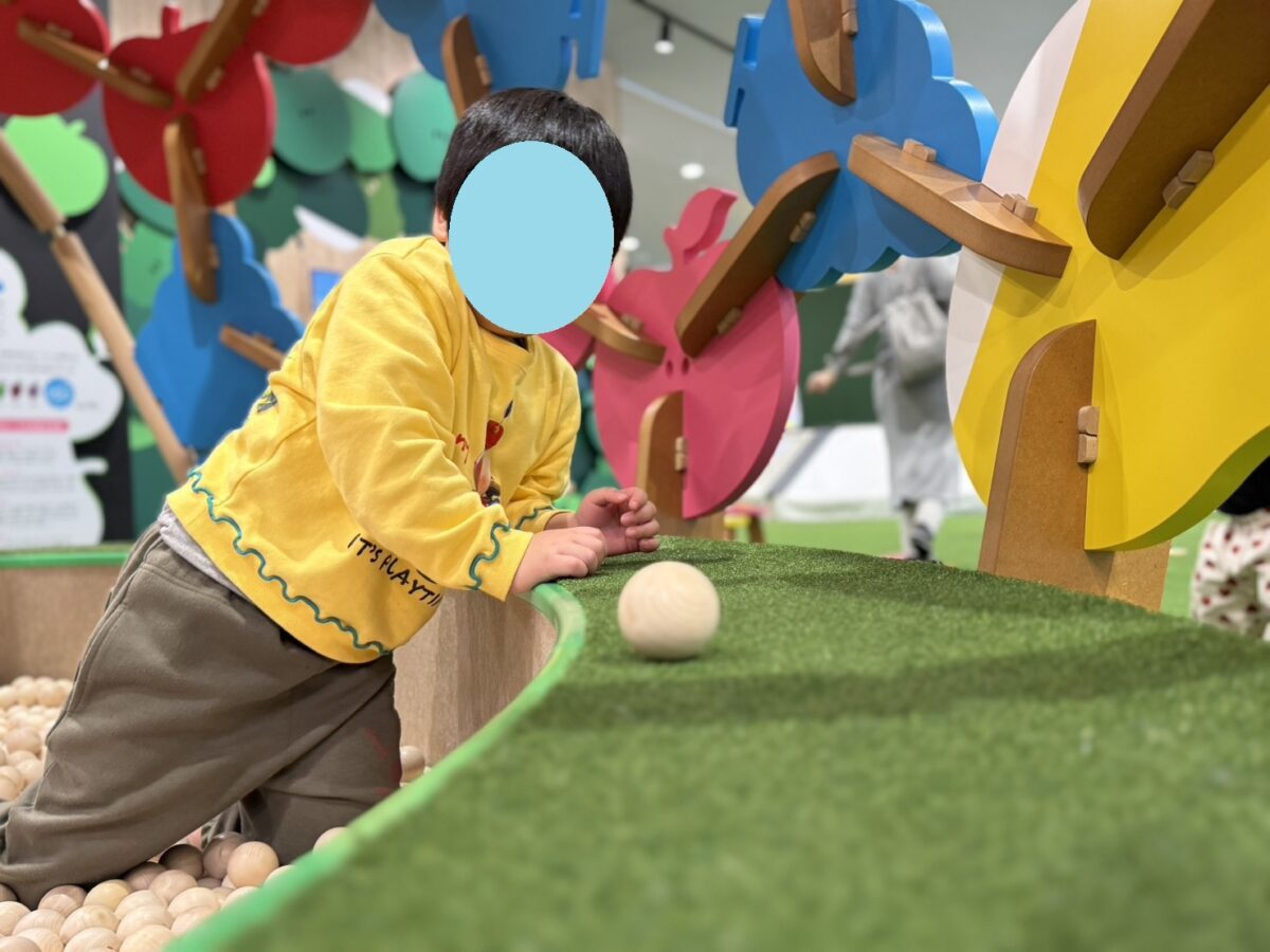 木のボールプールでは木の感触を楽しみながら転がして遊んでいました。