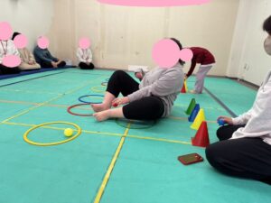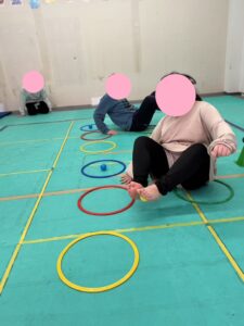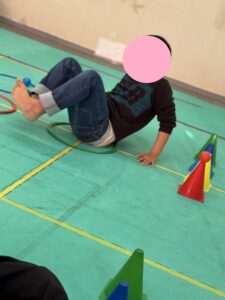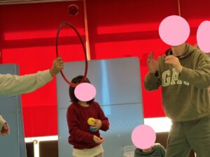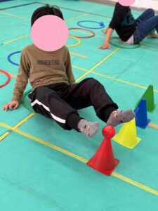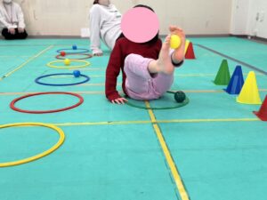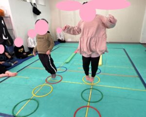 今日は、平均台を落ちないように歩いてフープは両足でジャンプしてもらいました。