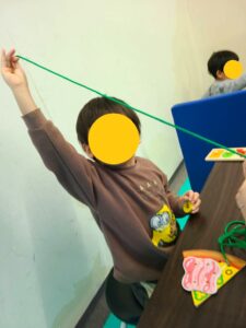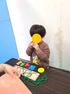 ぼくはひも通しに型はめが大好き!どんどん工夫して遊び方を開発したよ!