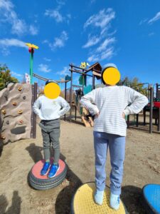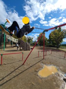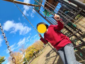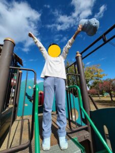 大型遊具は、雨が乾いて、大丈夫だよ!とっても気持ちいい!秋空を背景にてを伸ばしてみたよ!