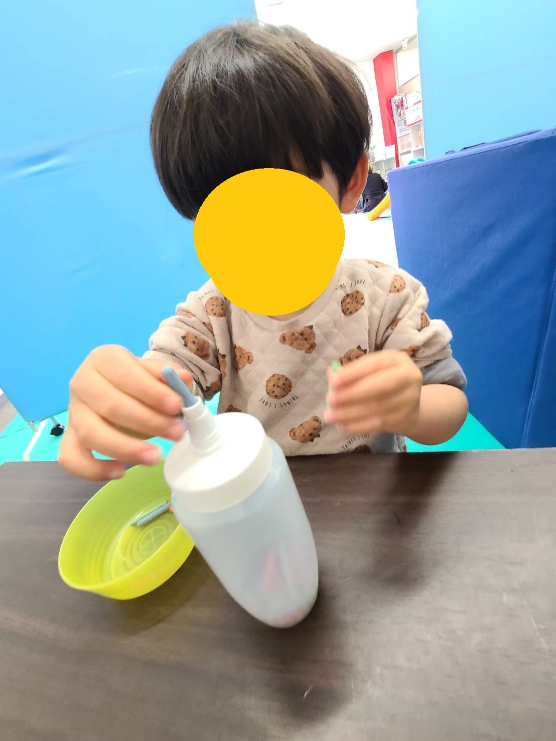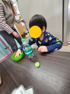 平たいプレートを細長い穴に入れてみるよ!小さなスポンジボールをペットボトルに入れるよ!ぼくはパズルに挑戦だい!