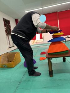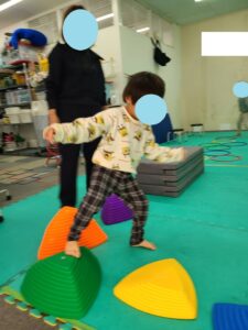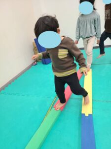 平均台をvの字に置き歩いてみたり、バランスストーンやバランスパットなど