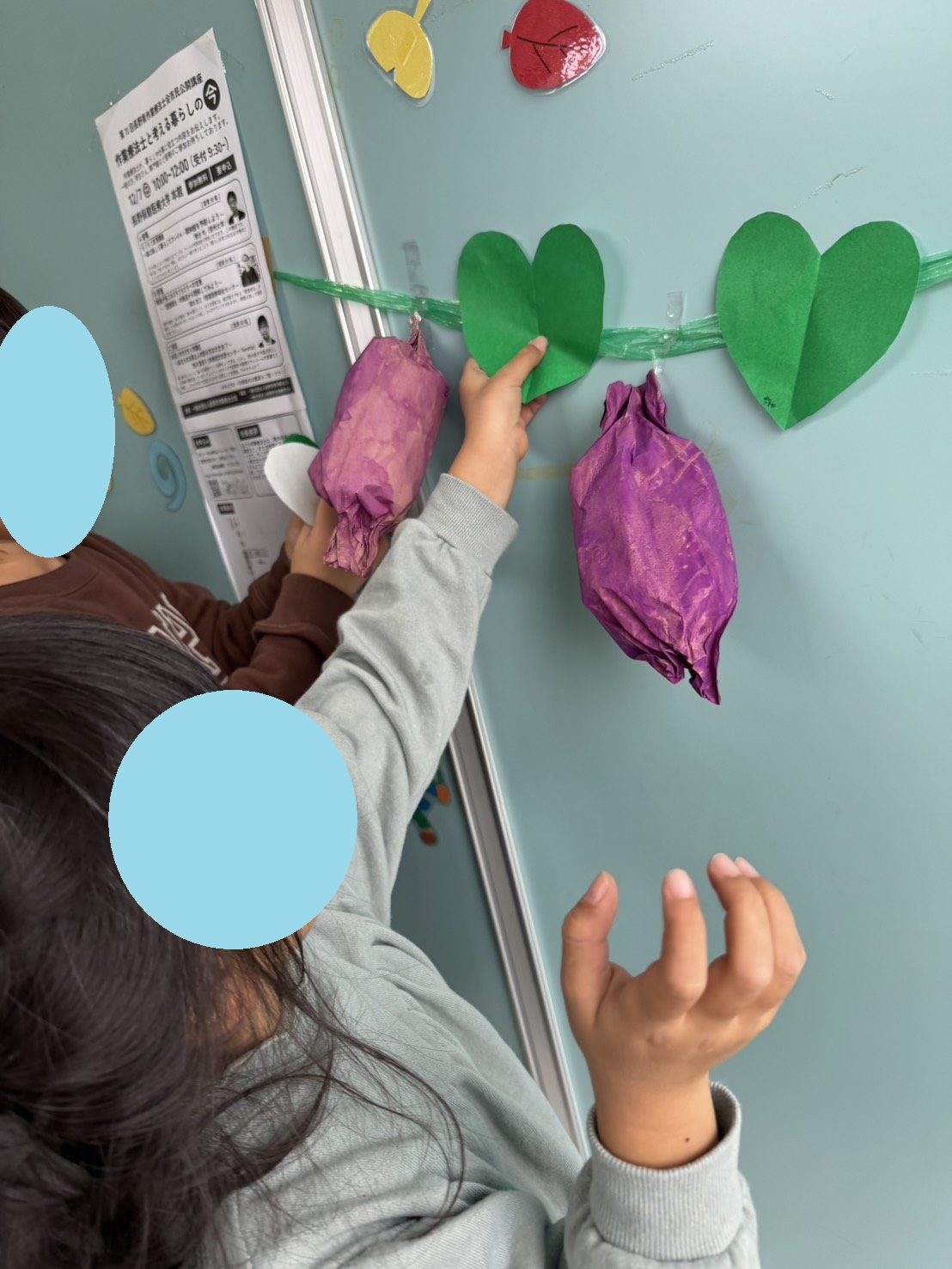 入口に緑の紐でつるを用意しておき自分たちでサツマイモを飾りました。